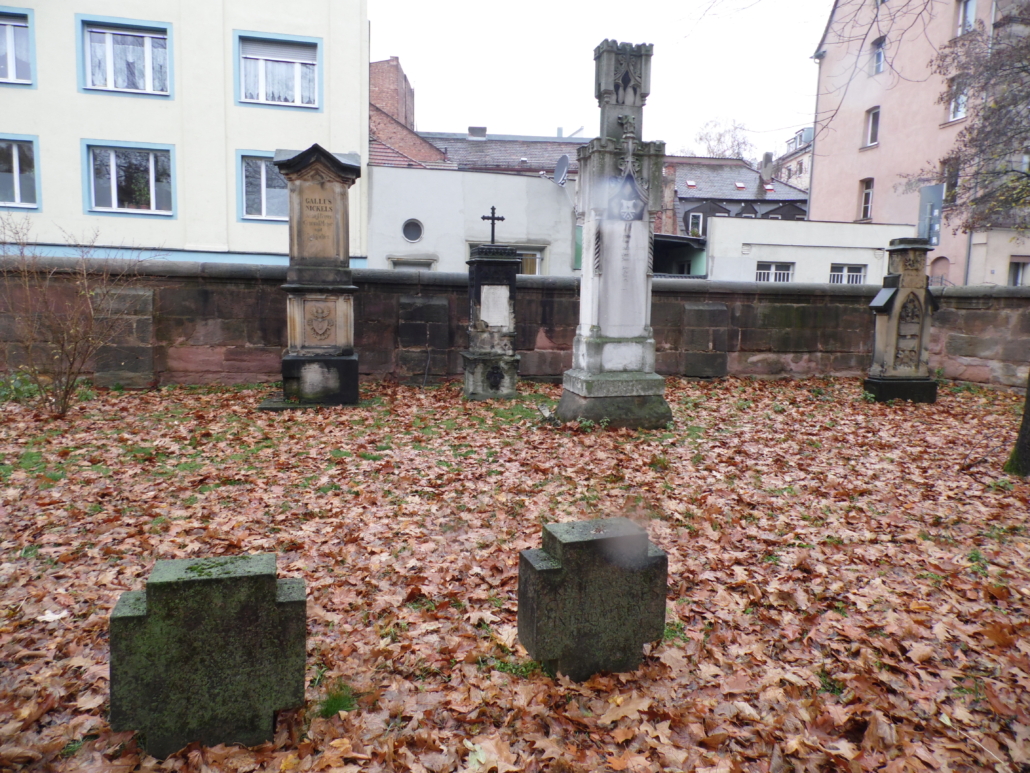 The St. Rochusfriedhof is located in the city district of Gostenhof on Rothenburger Straße and, together with the St. Johannisfriedhof, is managed by the Lutheran cemetery administration. With its unique combination of historic sandstone ashlars in the prescribed size of three by six “Werkschuh” (Nuremberg foot) with the metal name plaques, the so-called epitaphs, it presents Nuremberg city history as in a picture book. The artisan professions typical for the residents of the Lorenz part of the town are represented in numerous epitaphs with their tools and craft signs. Thus the epitaphs have eternalised over 90 professions here. Those laid to rest in this cemetery not only include craftsmen such as Peter Vischer, the brass and bronze caster, but also the composer Johann Pachelbel and the “Nuremberg hangman”, Franz Schmidt.
